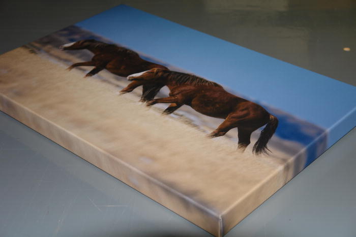 1. We start with a very high quality, thick, 21 mil poly-cotton blend canvas (Lexjet Sunset Matte Select). Its surface characteristics are unusually good, providing excellent color, deep dark blacks, sharp image detail, and a very flat reflectivity so as to avoid glare from lighting. Many of our competitors use thinner canvas or faux canvas. Also, many competitive products are glossy, making the canvas texture less apparent, and making it difficult to view the print except in ideal lighting conditions.